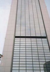 最近ビル外壁のガラスの外部側はグレイジングガスケットという成形ゴムを使った例が大部分です。 ノックダウン式(サッシ部材を現場で組み付ける)のサッシの場合は、地震時のサッシの変形に対しガ ラスを動かすことでガラスを破壊から守ります。グレイジングガスケットは、サッシとガラスの間にあって 両者の動きの違いをうまく緩衝してやらなければなりません。 当社は、現在にいたるまで数多くの高層ビルの実物大実験の経験によってノウハウを蓄積しております。